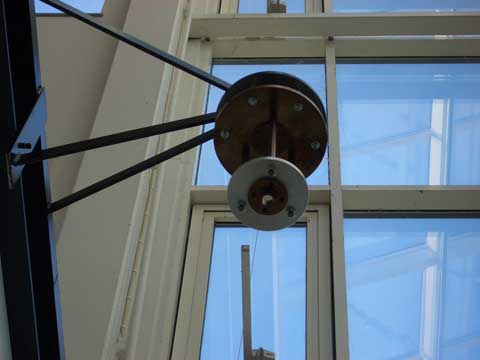 Utprovning med olika massor, längder på linan och elektronikinställningar kan börja. En andra prototyp, denna gång med ett större lod och den färdiga pendeln. |